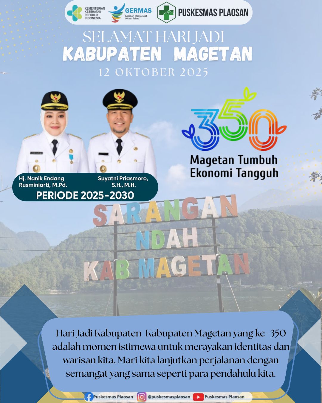 Puskesmas Plaosan 12 Oktober 2025 – Dengan penuh rasa syukur, hari ini kita memperingati 350 tahun perjalanan panjang Kabupaten Magetan – sebuah kabupaten yang kaya akan sejarah, budaya, dan potensi alam yang luar biasa. Dari lereng Gunung Lawu hingga telaga-telaga yang menyejukkan hati, Magetan tumbuh menjadi daerah yang terus bergerak maju dalam pembangunan, pendidikan, ekonomi, serta pelestarian nilai-nilai kearifan lokal.