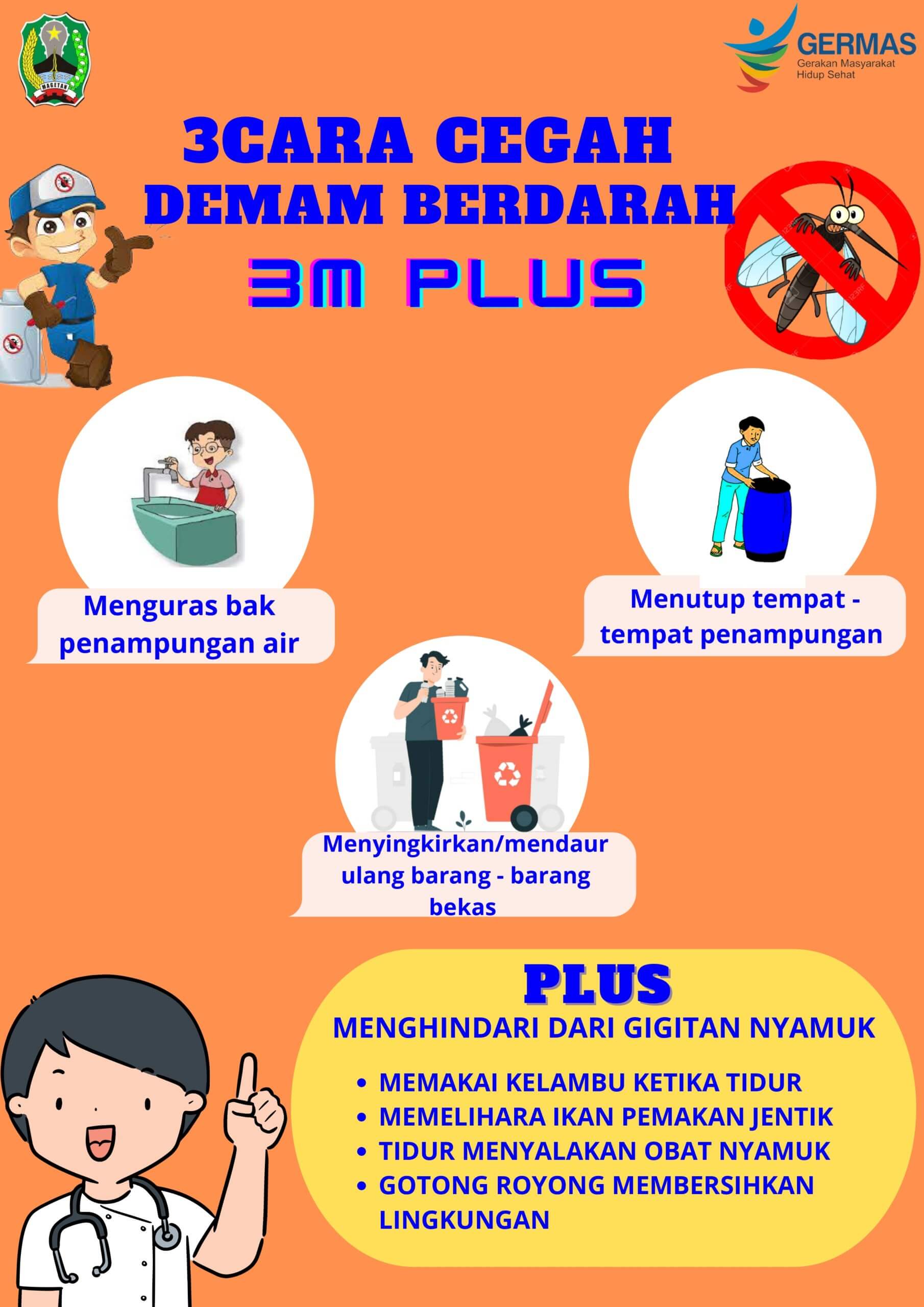 Demam berdarah dengue (DBD), merupakan salah satu penyakit yang harus di waspadai karena dapat menimbulkan kematian dan dapat terjadi karena lingkungan yang kurang bersih. 3M plus pasti tidak asing lagi ditelinga masyarakat. 3M plus salah satu program dari Kementrian Kesehatan. 3M plus yaitu :