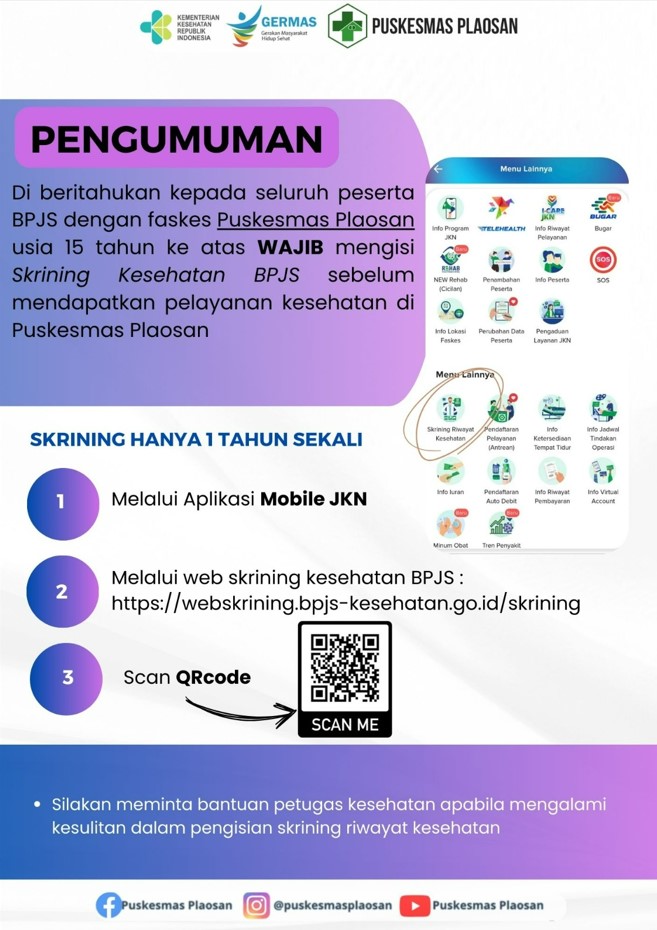04 September 2025, Diberitahukan kepada seluruh peserta BPJS dengan Faskes Puskesmas Plaosan usia 15 tahun ke atas WAJIB mengisi Skrining Kesehatan BPJS sebelum mendapatkan pelayanan kesehatan di Puskesmas Plaosan